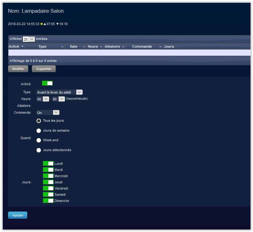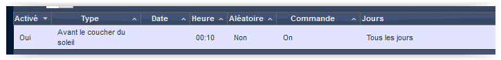 Reste à gérer la planification de l’allumage de cette lampe, on voulait qu’elle s’allume tous les jours 10 minutes avant de coucher du soleil. Donc on appuie sur le bouton « planning » pour faire ça.