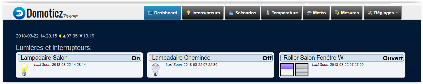 Voici la présentation de base de Domoticz avec 2 lampes, 1 volet roulant pour l’exemple.