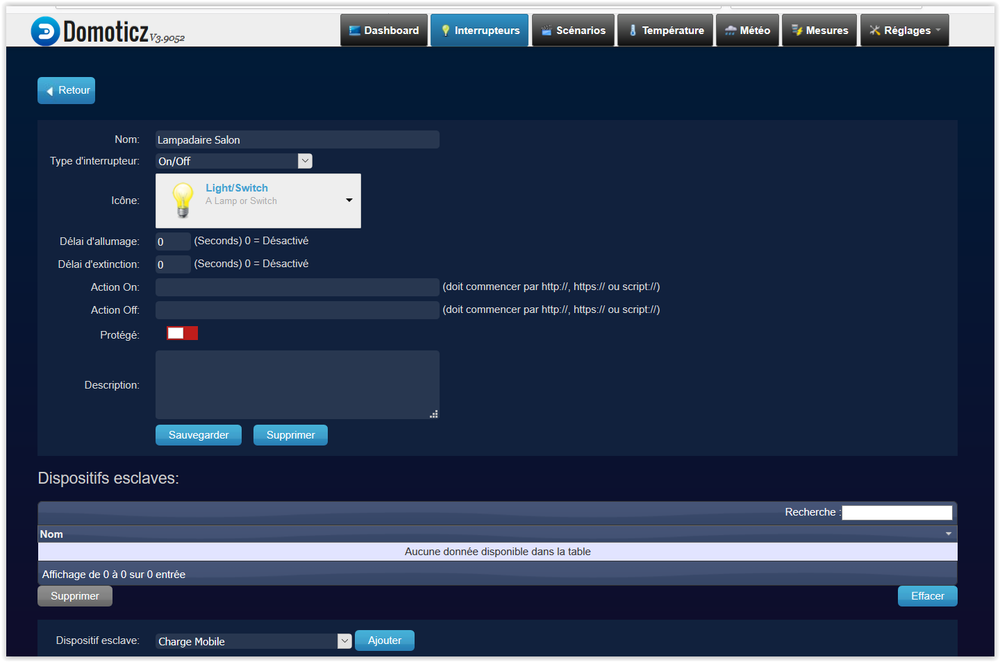 Bon notre but est de modifier au niveau de la lampe de « Lampadaire Salon » pour répondre à l’exemple annoncé dans l’article précédent. Dans l’onglet « Interrupteur » on retrouve tous les modules et le nôtre tout particulièrement avec l’accès aux fonctions de modification et de planification (entre autres).