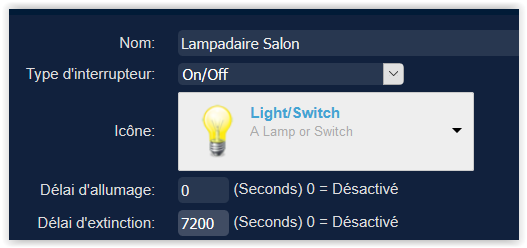Ensuite il y a la possibilité de saisir une durée d’extinction, nous on voulait que cette lampe s’éteigne au bout de 2h soit 7200 secondes, on va donc mettre 7200 dans ce champ. 1ère exigence réalisée !