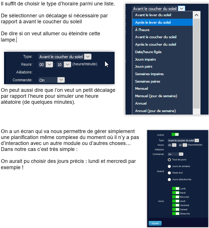 On peut ajouter autant de planification que l’on désire, notamment pour gérer en fonction des jours de la semaine… c’est très complet.