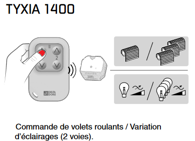 C’est une télécommande porte-clé qui est composé de 4 touches TYXIA 1400. Elle permet la variation d’éclairage ainsi que la montée et descente de volets roulants. Ceci pour les produits de marque Delta Dore bien entendu.