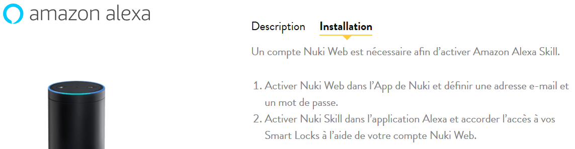 Avec Nuki Skill pour Amazon Alexa, vous pouvez tout simplement contrôler votre Nuki Smart Lock à l’aide de vos appareils Echo ainsi que tous les appareils compatibles avec Alexa. Vous pouvez à tout moment consulter le statut de votre Smart Lock et ouvrir la porte à d’éventuels invités.